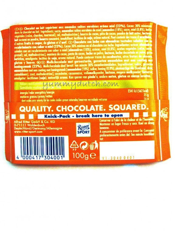 Proef eens de nieuwe smaak van Ritter Sport: melkchocolade met geroosterde, gezouten amandelen en een coating met honingsmaak.