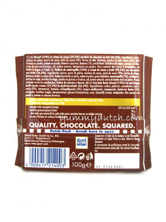 Lekkere chocolade van Ritter Sport met krokante petit beurre koekjes in zachte cacao creme.