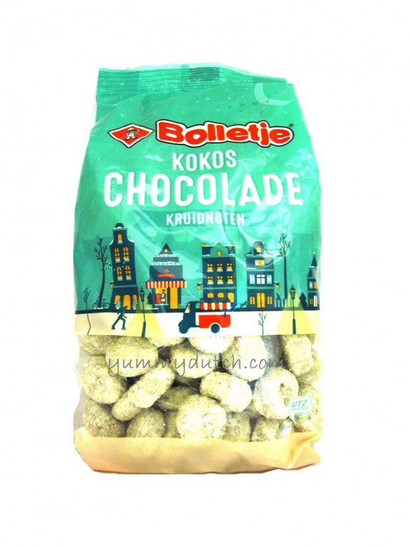 For a tropic mood in the winter: coconut chocolate kruidnoten (peppernuts or gingernuts) from Bolletje! This special kruidnoten are covered with creamy white chocolate and coconut shavings. Very delicious!